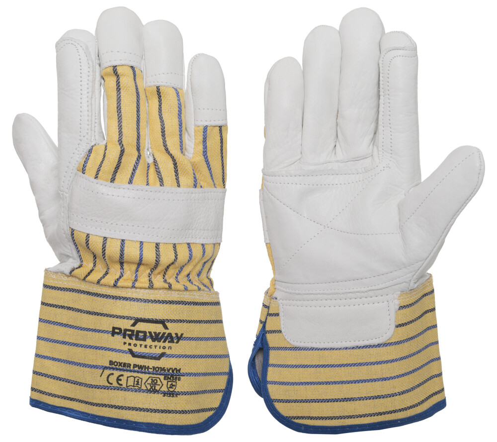 De Proway PWH-1014VVW is een werkhandschoen uit de Boxer Serie. De Boxer serie bestaat uit authentieke, zeer sterke werkhandschoenen met hoge kwaliteit leder. De PWH-1014VVW is gemaakt van A-kwaliteit Rundnerfleder in combinatie met gestreept katoenen doek. Rundnerfleder is flexibel en zorgt voor veel comfort, heeft een goede scheurweerstand en biedt een optimale schuurweerstand. Het katoen zorgt voor een hoog ademend vermogen. De PWH-1014VVW is voorzien van een pistoolversterking, een strip leder over de handpalm, duim en wijsvinger voor extra stevigheid, en gerubberiseerde kap van 7 cm. Deze handschoen is uitermate geschikt voor afvalverwerking, algemene werkzaamheden, bouw, constructie, industrie, luchtvaartindustrie, metaalbewerking, plaatwerk, metaalgieterijen, scheepvaart, transport, logistiek, wegenbouw, waterbouw, infra. Kies voor de Proway PWH-1014VVW en ervaar de duurzaamheid van onze A-kwaliteit lederen handschoenen.
