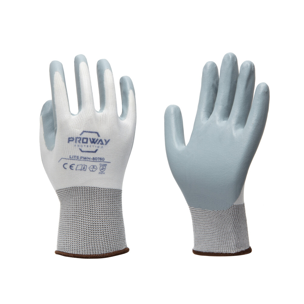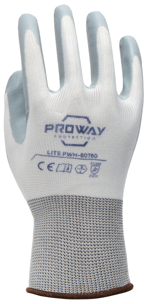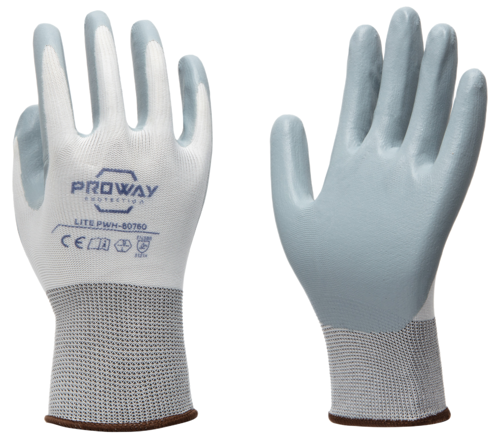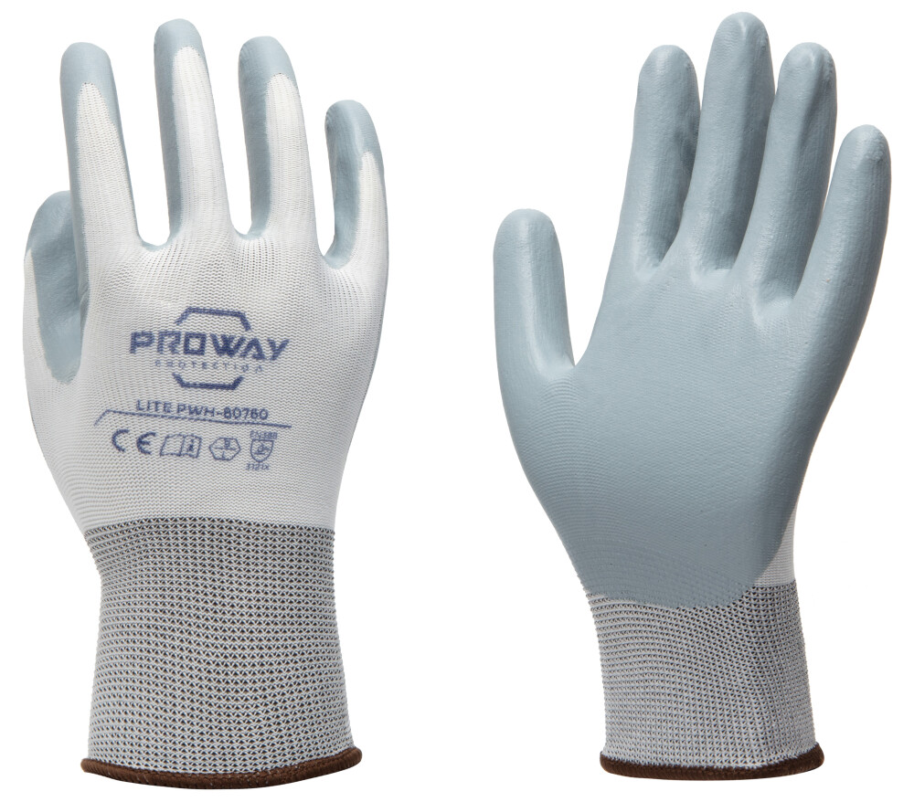 De Proway PWH-80760 is een werkhandschoen uit de Lite Serie. De Lite serie heeft een ideale prijs/kwaliteit verhouding en voldoet aan de nieuwste normeringen. De PWH-80760 heeft een 13G naadloos gebreide liner van Polyester. Een liner van polyester is elastisch, sterk en is bestand tegen slijtage. De PWH-80760 is voorzien van een nitril handpalm coating. Een nitril coating flexibel en biedt goede bescherming tegen schuren. De coating bevat geen latex wat de kans op allergische reacties verkleint en beschermt in zekere mate tegen zuren en olie.
