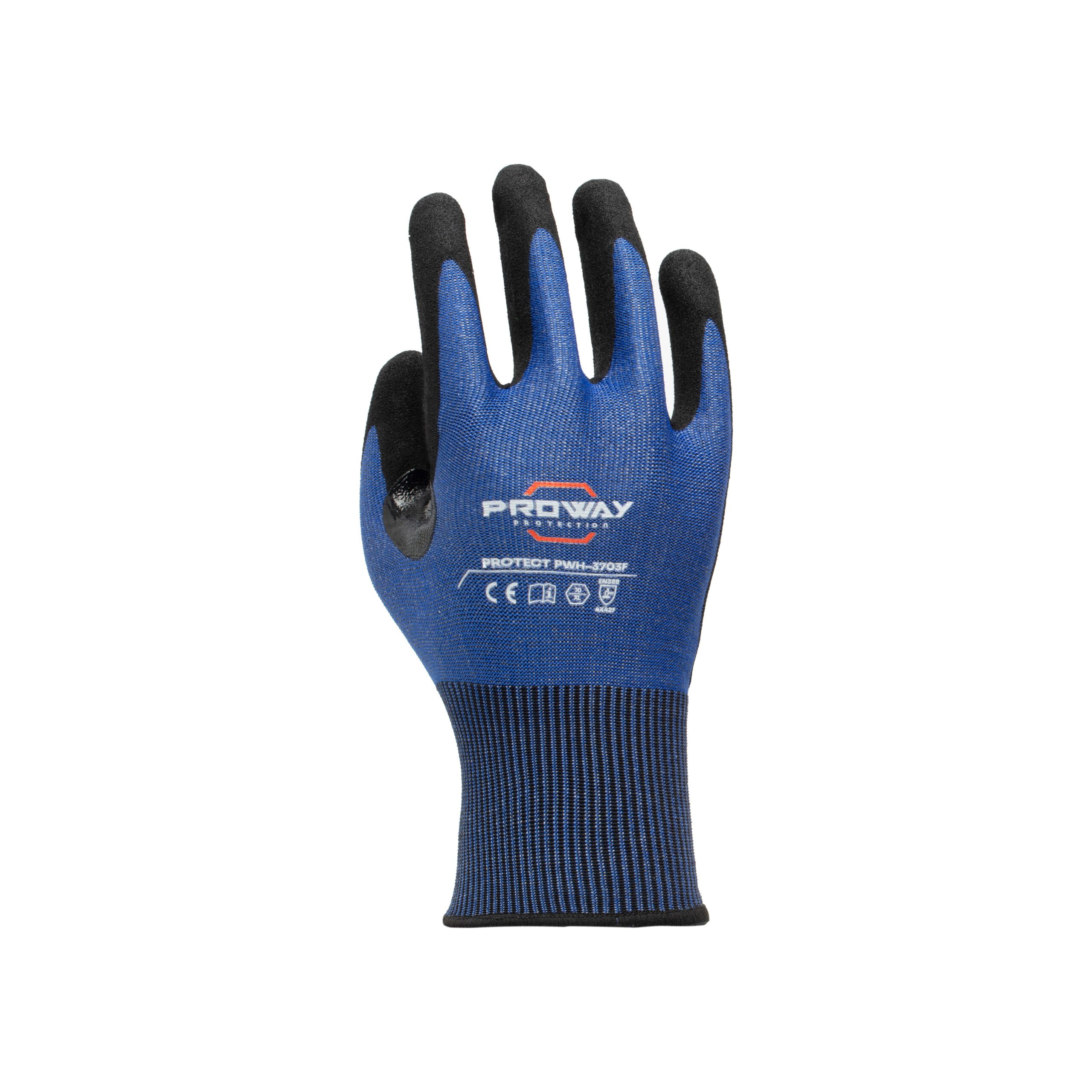De Proway PWH-3703F is een werkhandschoen uit de Protect Serie. De Protect serie biedt snijbestendigheid volgens de nieuwste normering zonder in te leveren op comfort. De PWH-3703F heeft een 18G liner van Gerecycled polyester/Spandex/Pro-Cut. Bij een liner van gerecycled polyester wordt er geen nieuw materiaal gebruikt wat zorgt voor het verkleinen van de afvalberg. Desondanks behoudt het alle eigenschappen van nieuw polyester, dus de handschoen blijft elastisch, sterk en bestand tegen slijtage. Spandex is flexibel, zorgt voor een ergonomische pasvorm en voegt een hoog ademend vermogen en schuurweerstand toe. Pro-Cut voegt snijbestendigheid toe. De PWH-3703F is voorzien van een nitril coating, extra versteviging tussen duim en wijsvinger en is geschikt voor touchscreen. Een nitril coating is flexibel en biedt goede bescherming tegen schuren. De coating bevat geen latex wat de kans op allergische reacties verkleint en beschermt in zekere mate tegen zuren en olie. De versteviging tussen duim en wijsvinger maakt de handschoen minder gevoelig voor slijtage en zorgt voor extra veiligheid. De touchscreen functionaliteit maakt deze handschoen geschikt voor het werken met smartphones, scanners en andere apparaten met touchscreen.