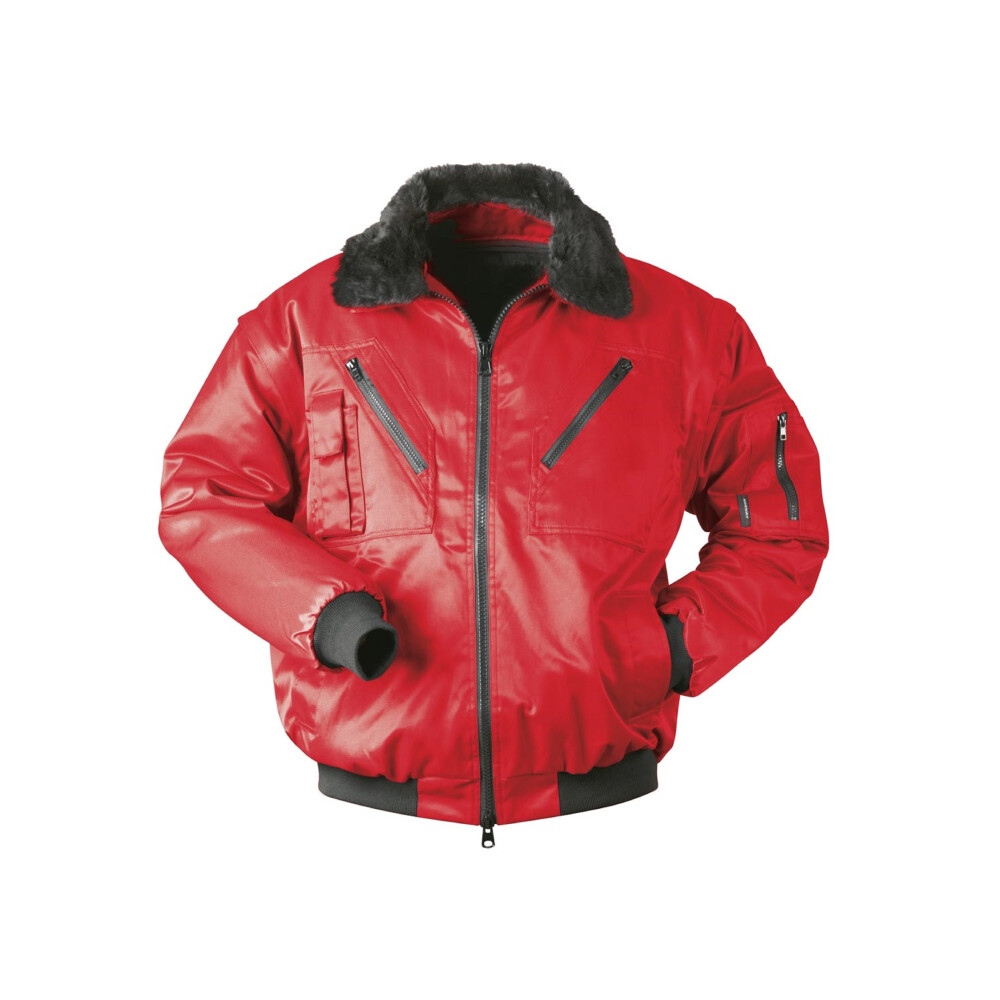 De Proway PWK-2001 is een rode 4-in-1 pilotjack. Deze jas is multifunctioneel door de afneembare kraag en mouwen en uitneembare imitatie bonten voering. De zachte voering zorgt voor comfort en warmte. De gebreide manchetten zorgen ervoor dat de jas goed aansluit op de pols waardoor kou buitengehouden wordt. De buitenkant is gemaakt van een slijtvast mengsel van katoen en polyester en is waterafstotend door de aangebrachte hoogwaardige coating. De pilotjack is verder voorzien van een robuuste 2-weg rits, 2 borstzakken, 2 voorzakken, 1 mouwzak en een binnenzak.
