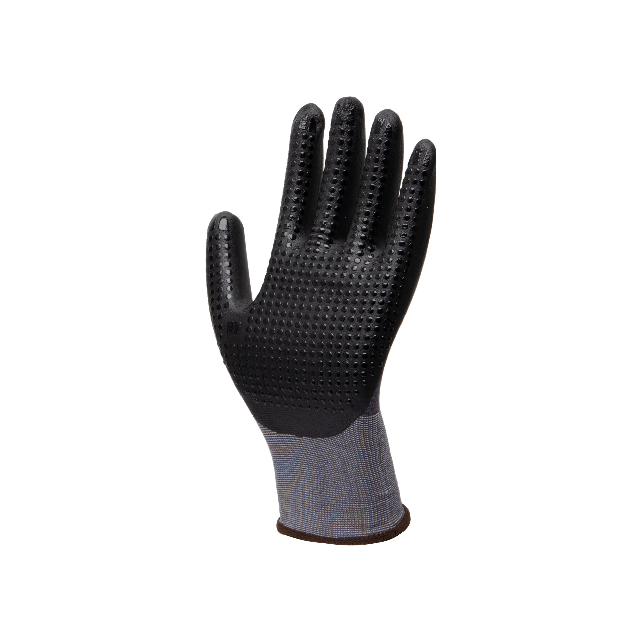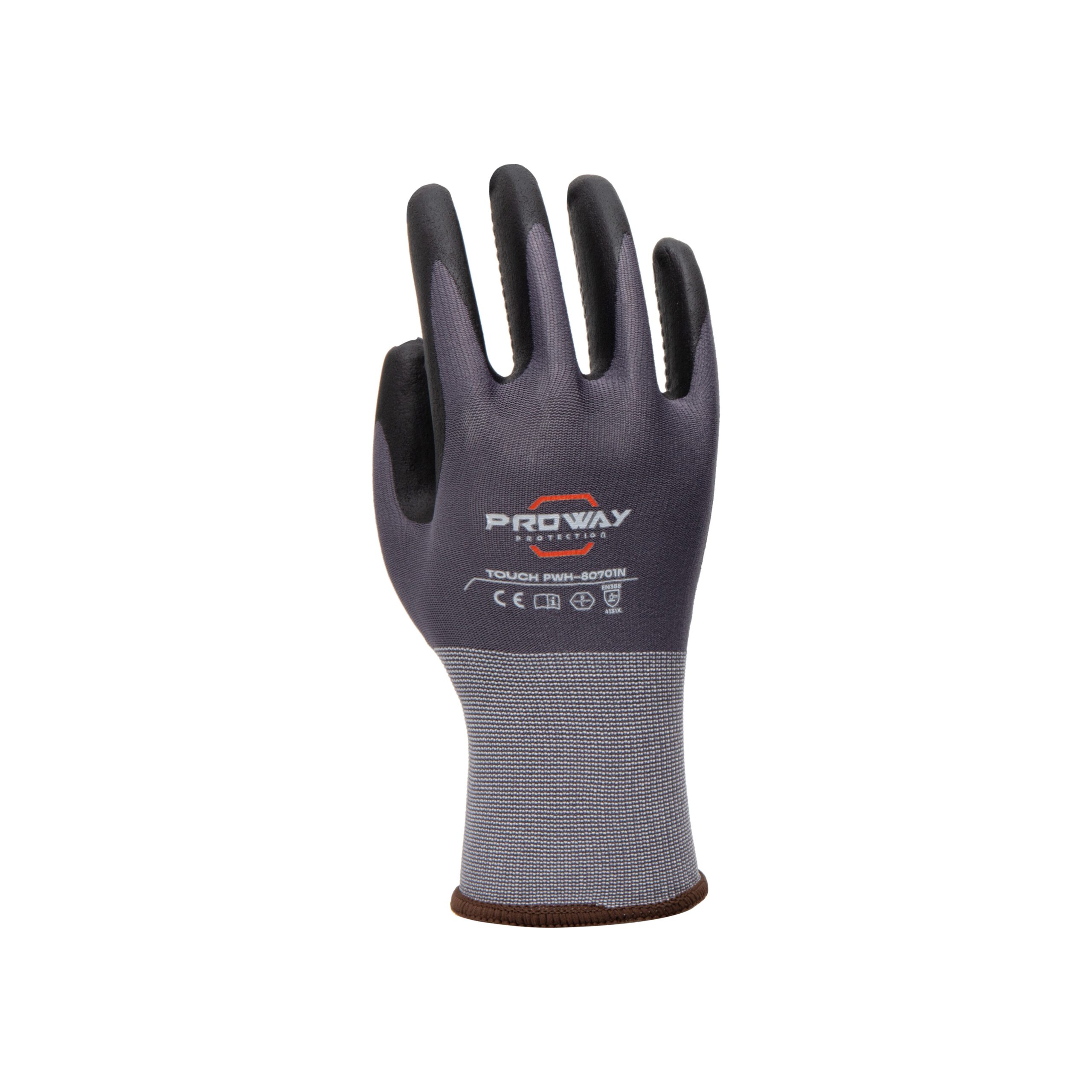 De Proway PWH-80701N is een werkhandschoen uit de Touch Serie. Handschoenen in de Touch Serie voldoen aan de hoogste kwaliteitseisen. De PWH-80701N heeft een 15G naadloos gebreide liner van Nylon/Spandex. Een liner van nylon/spandex is elastisch, slijtvast en licht en biedt goede dexterity. Deze liner zorgt voor een ergonomische pasvorm en heeft een hoog ademend vermogen en schuurweerstand. De PWH-80701N is voorzien van een nitril handpalm coating met nopjes. Een nitril coating is flexibel en biedt goede bescherming tegen schuren. De coating bevat geen latex wat de kans op allergische reacties verkleint en beschermt in zekere mate tegen zuren en olie. De nopjes zorgen voor extra grip.