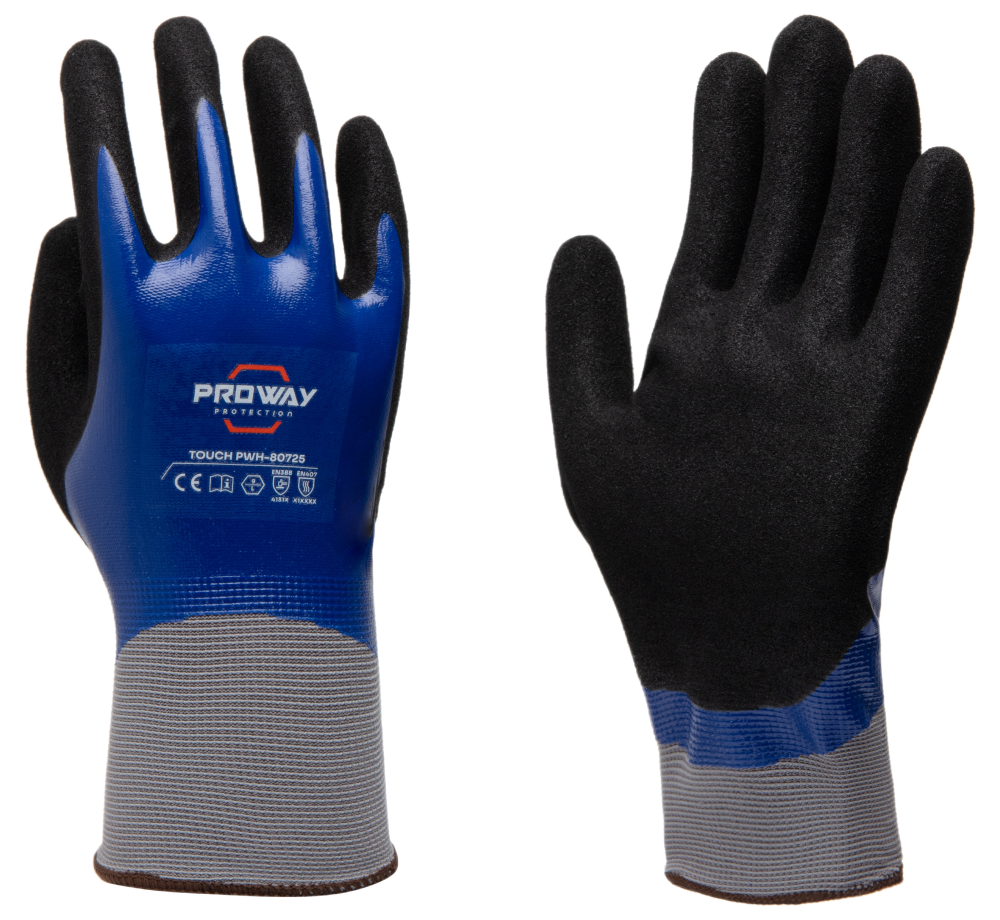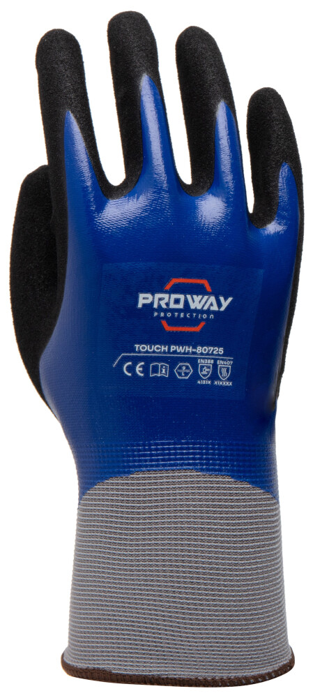 De Proway PWH-80725 is een werkhandschoen uit deTouch Serie. De Touch serie voldoet aan de hoogste kwaliteitseisen in de industrie. De PWH-80725 heeft een 15G naadloos gebreide liner van nylon. Een liner van nylon is elastisch, slijtvast en licht en biedt goede dexterity. De PWH-80725 is voorzien van een nitril volledige coating. Een nitril coating is flexibel en biedt goede bescherming tegen schuren en beschermt in zekere mate tegen zuren en olie. De coating bevatgeen latex wat de kans op allergische reacties verkleint. De volledige coating zorgt ervoor dat de handschoen waterdicht is.