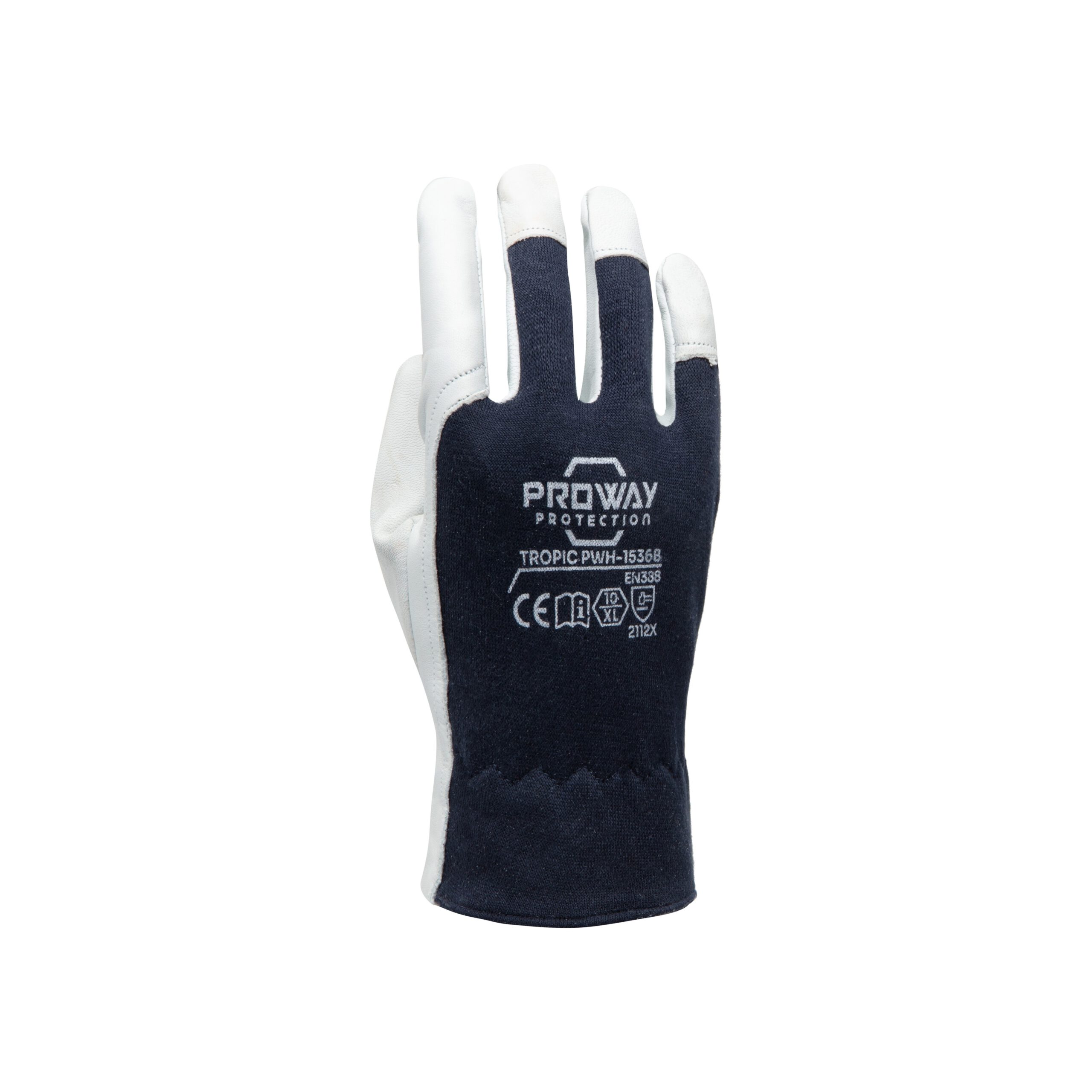 De Proway PWH-1536B is een werkhandschoen uit de Tropic Serie. De Tropic serie bestaat uit flexibele werkhandschoenen met hoge kwaliteit leder. De PWH-1536B is gemaakt van A-kwaliteit Schaapsnappaleder in combinatie met katoenen interlock handrug. Schaapsnappaleder biedt optimale flexibiliteit en is door de elastische eigenschappen zeer comfortabel. De katoenen interlock handrug is rekbaar en absorbeert zweet. De PWH-1536B is voorzien van een ronde duim die aan de handpalm gestikt is, een versteviging bij de duim en wijsvinger, en een elastiek bij de pols.