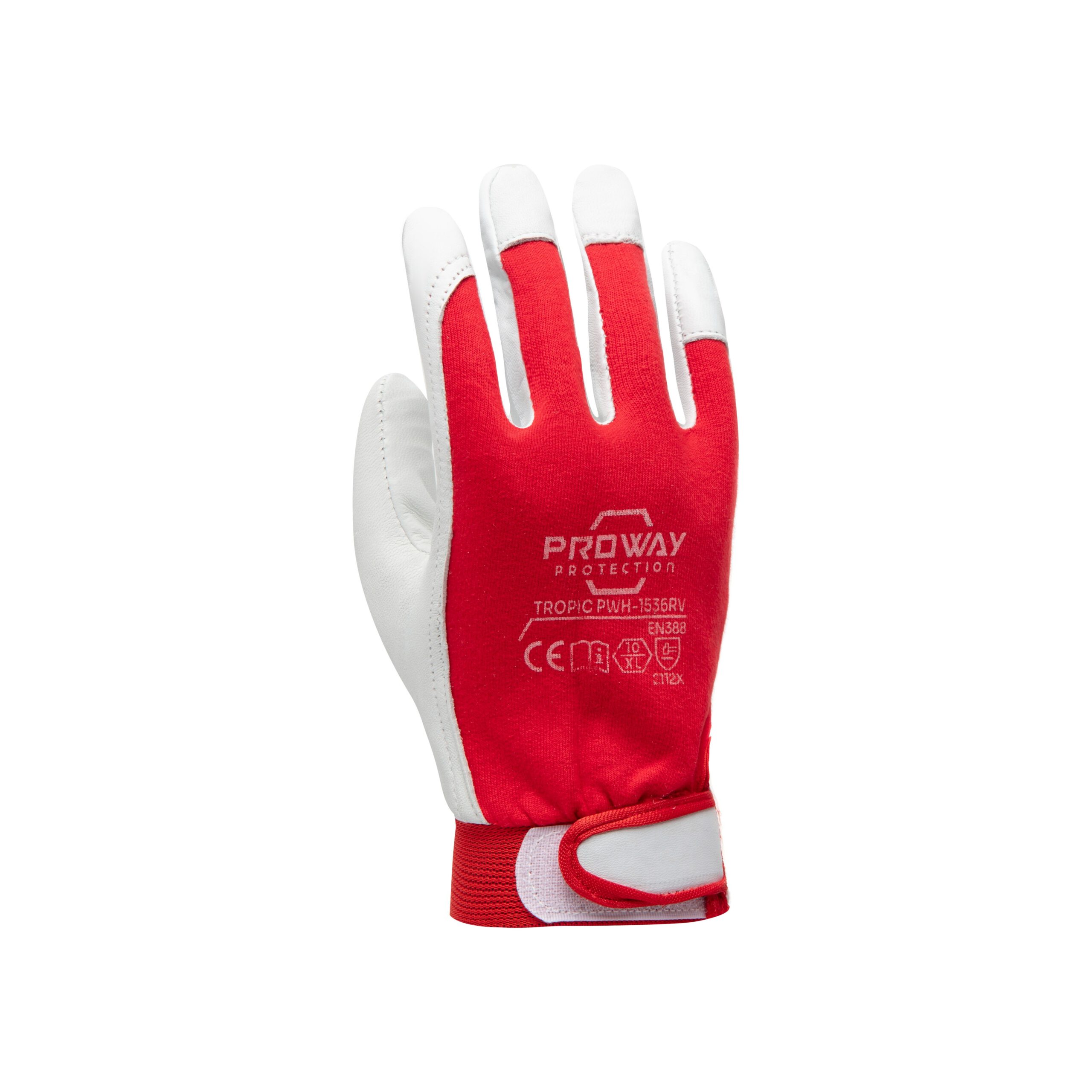 De Proway PWH-1536RV is een werkhandschoen uit de Tropic Serie. De Tropic serie bestaat uit flexibele werkhandschoenen met hoge kwaliteit leder. De PWH-1536RV is gemaakt van A-kwaliteit Schaapsnappaleder in combinatie met katoenen interlock handrug. Schaapsnappaleder biedt optimale flexibiteit en is door de elastische eigenschappen zeer comfortabel. De katoenen interlock handrug is rekbaar en absorbeert zweet. De PWH-1536RV is voorzien van een ronde duim die aan de handpalm gestikt is, een extra versteviging bij de duim en wijsvinger, en een klittenband sluiting.