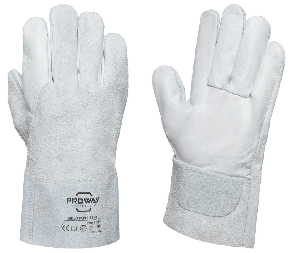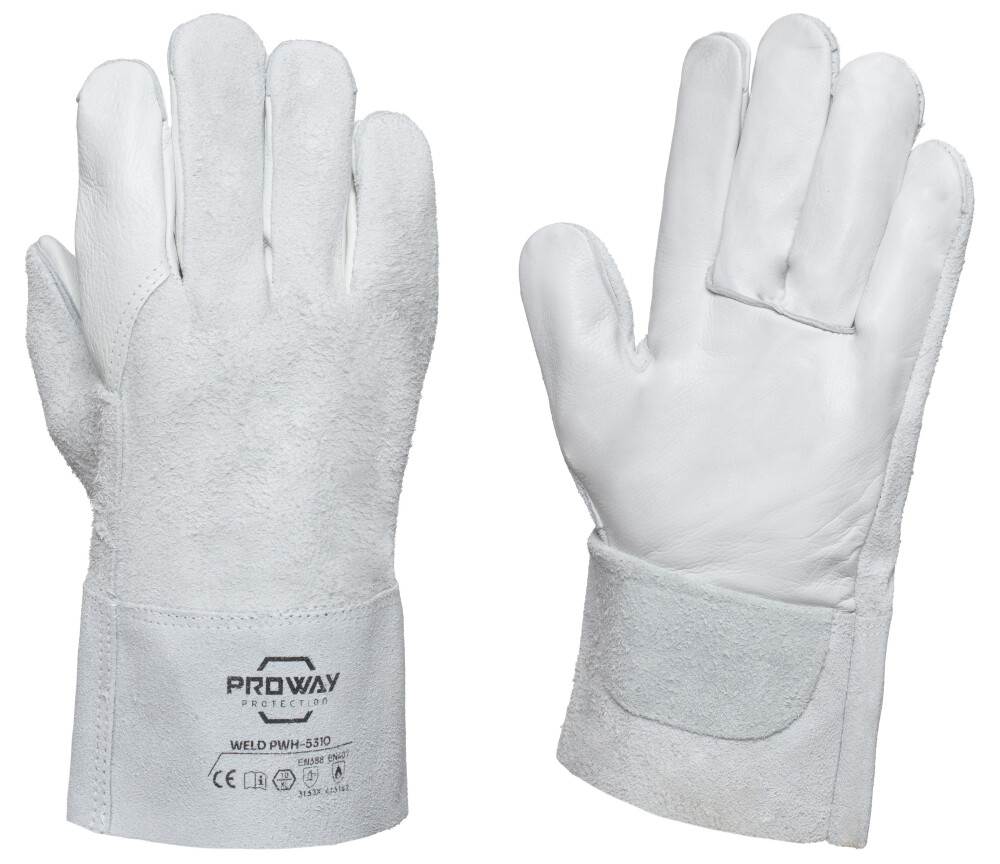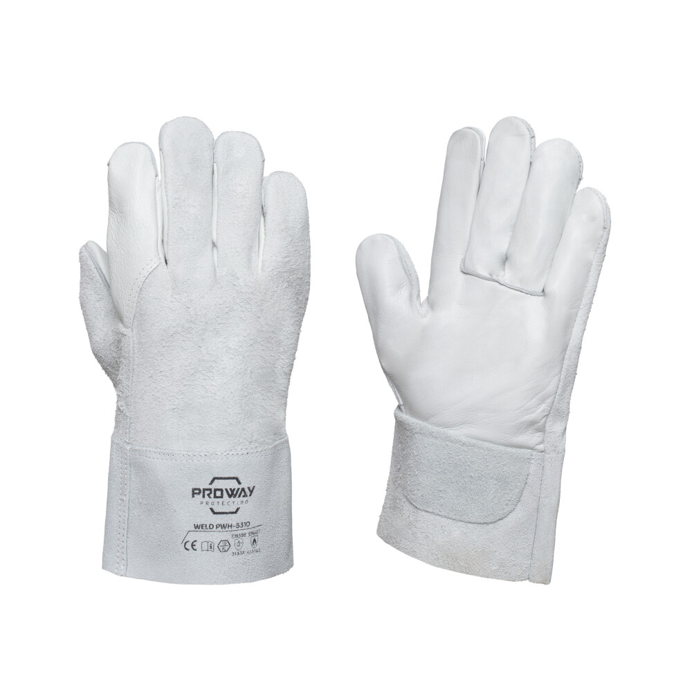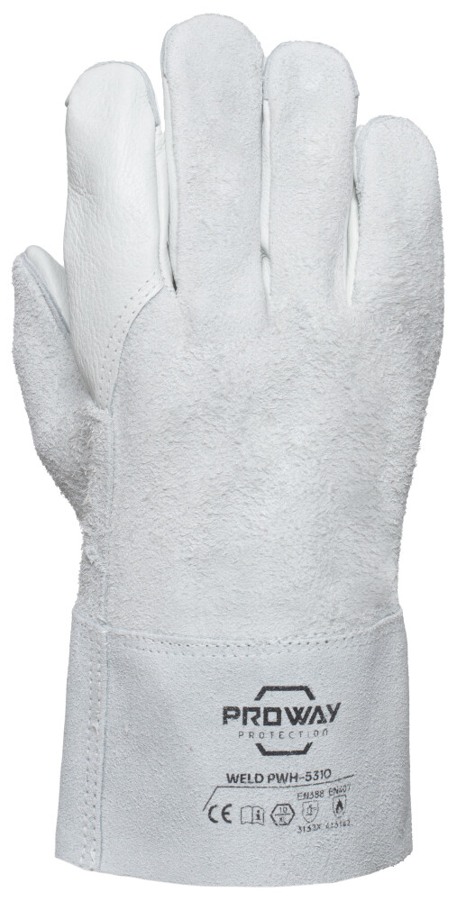 De Proway PWH-5310 is een werkhandschoen uit de Weld Serie. De PWH-5310 heeft een handpalm van rundnerfleder en handrug van rundsplitleder. Rundnerfleder heeft een goede scheurweerstand, is flexibel en zorgt voor veel comfort wat ideaal is voor de handpalm. De handrug van rundsplitleder heeft een goede scheurweerstand, is licht perforatiebestendig en biedt een optimale schuurweerstand. De PWH-5310 is voorzien van een veiligheidskap van 8 cm.