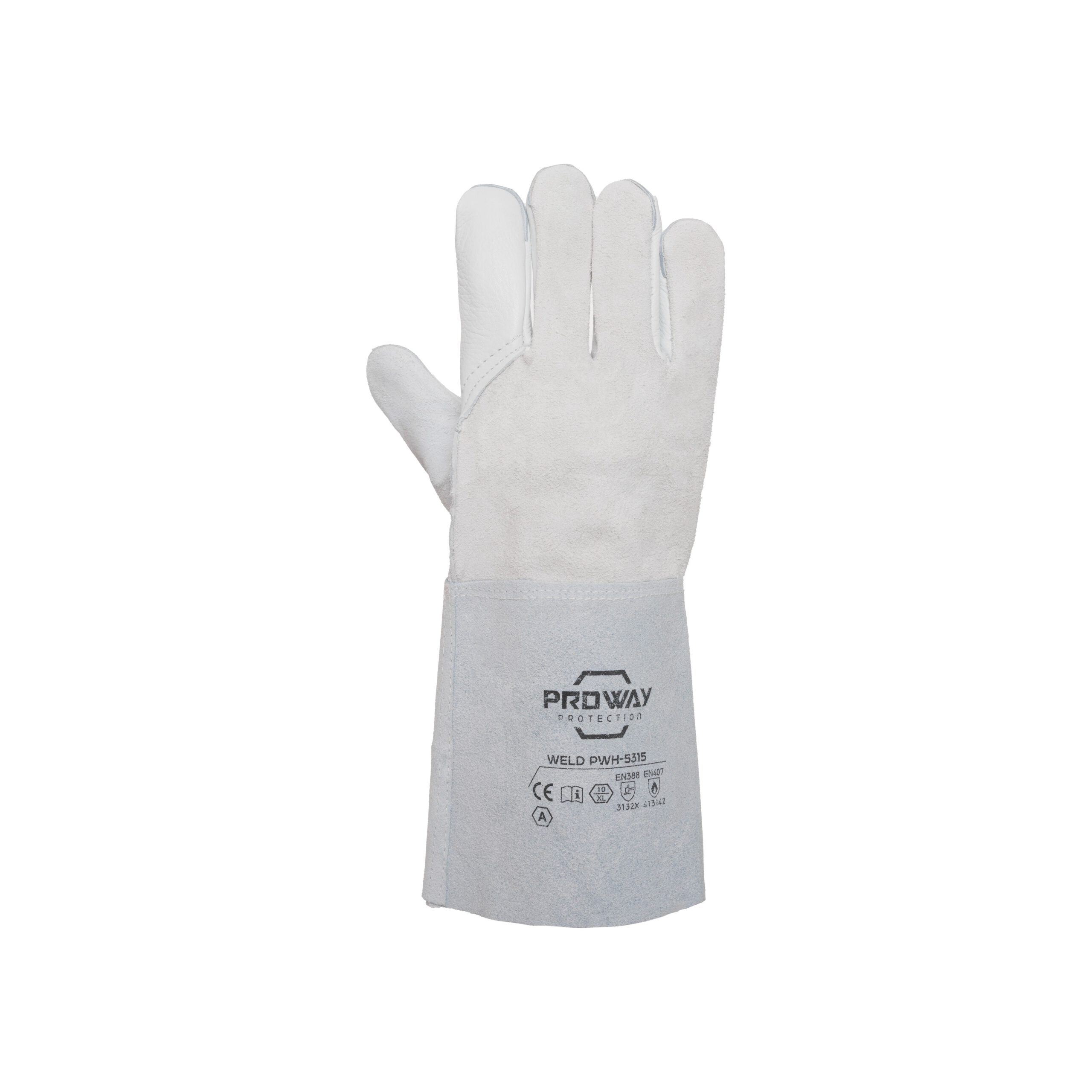 De Proway PWH-5315 is een werkhandschoen uit de Weld Serie. De Weld serie bestaat uit lashandschoenen die naast comfort ook optimale bescherming bieden bij laswerkzaamheden. De PWH-5315 heeft een handpalm van rundnerfleder en handrug van rundsplitleder. Rundnerfleder heeft een goede scheurweerstand, is flexibel en zorgt voor veel comfort wat ideaal is voor de handpalm. De handrug van rundsplitleder heeft een goede scheurweerstand, is licht perforatiebestendig en biedt een optimale schuurweerstand. De PWH-5315 is voorzien van een veiligheidskap van 15 cm.