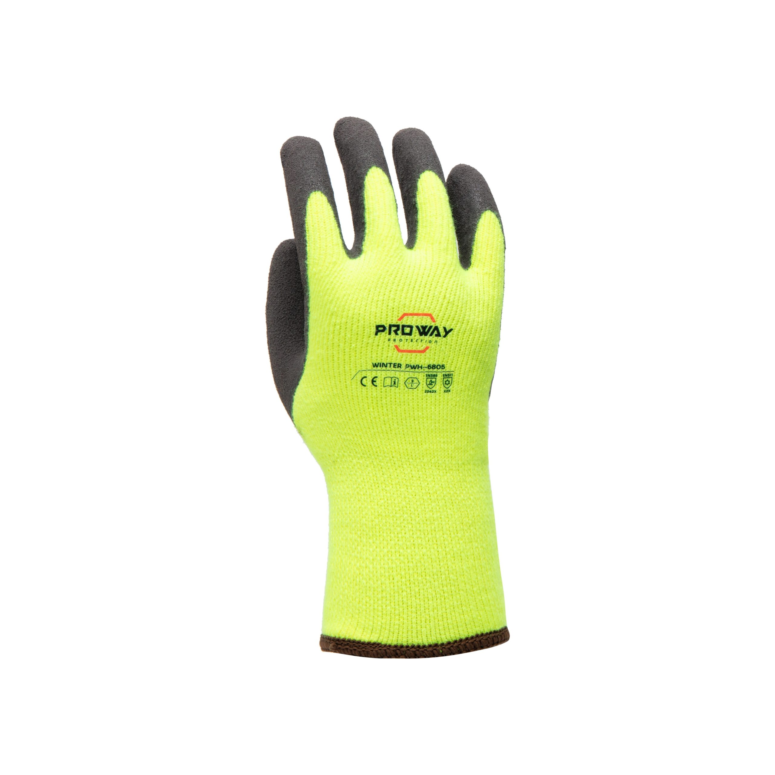 De Proway PWH-6805 is een werkhandschoen uit de Winter Serie. De Winter Serie combineert bescherming in koude omgevingen met draagcomfort. De PWH-6805 heeft een 10G naadloos gebreide Acryl terry liner. Een liner van Acryl isoleert goed tegen kou. Acryl heeft een hoge schuurweerstand en is bestand tegen een grote trekkracht. De PWH-6805 is voorzien van een latex handpalm coating. Een latex coating is flexibel, bestand tegen scheuren en biedt een optimale grip. Deze coating is waterdicht en beschermt in zekere mate tegen zuren en schoonmaakmiddelen.